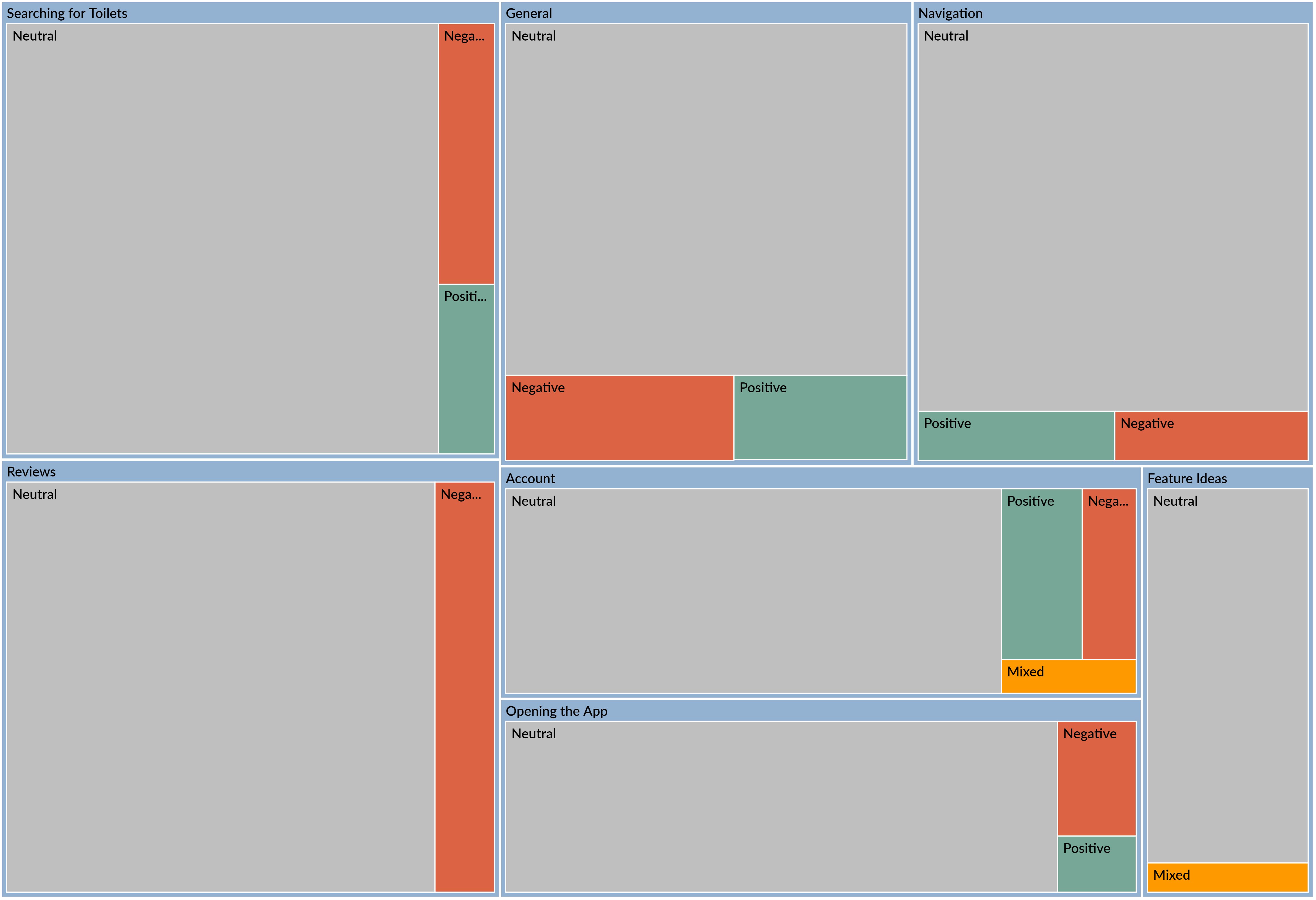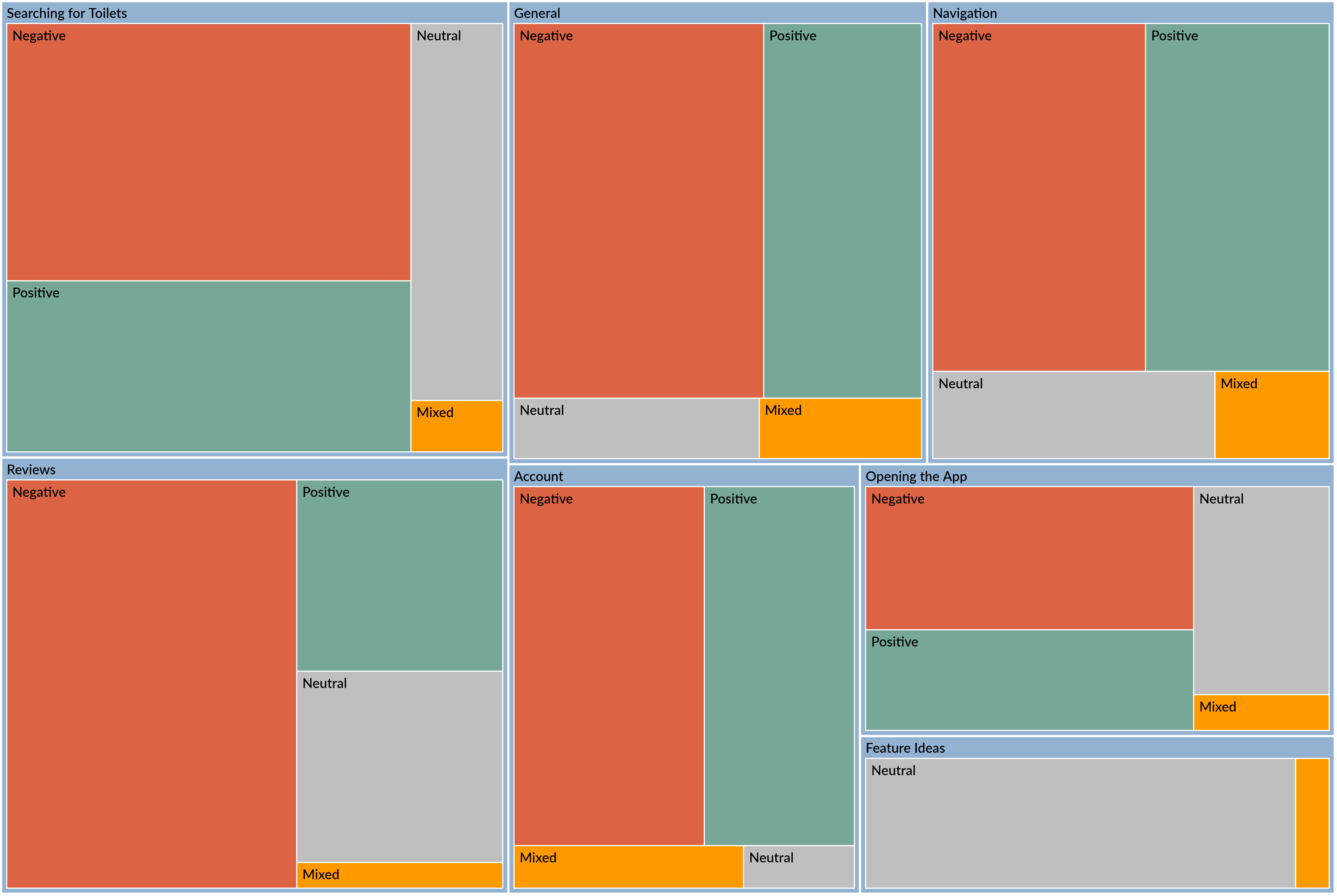 Lack of distance and time to toilet information was a strongly negative piece of feedback, most users felt that this is a necessary feature for this app. The positive sentiment comes from the implementation of the different transport modes available, users found these to be useful.